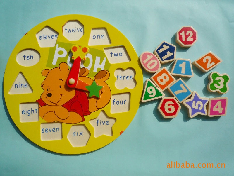 拼图由两个可旋转的表针,十二个数字及对应数字的十二个物体拼块构成,每一块都是独立的板块,宝宝根据其形状,数字及颜色将其拼入相应的位置。